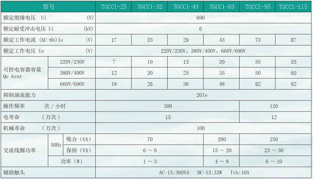 TGCC1 系列切換電容器接觸器 ( 以下簡稱接觸器 ), 主要用于交流 50Hz( 或 60Hz)、額定工作電壓至 690V, 在 AC-6b 使用類別下可控制電容器容量至 50kvar 的電力系統中 , 接通和分斷并聯電容器,以作為改善功率因數之用。